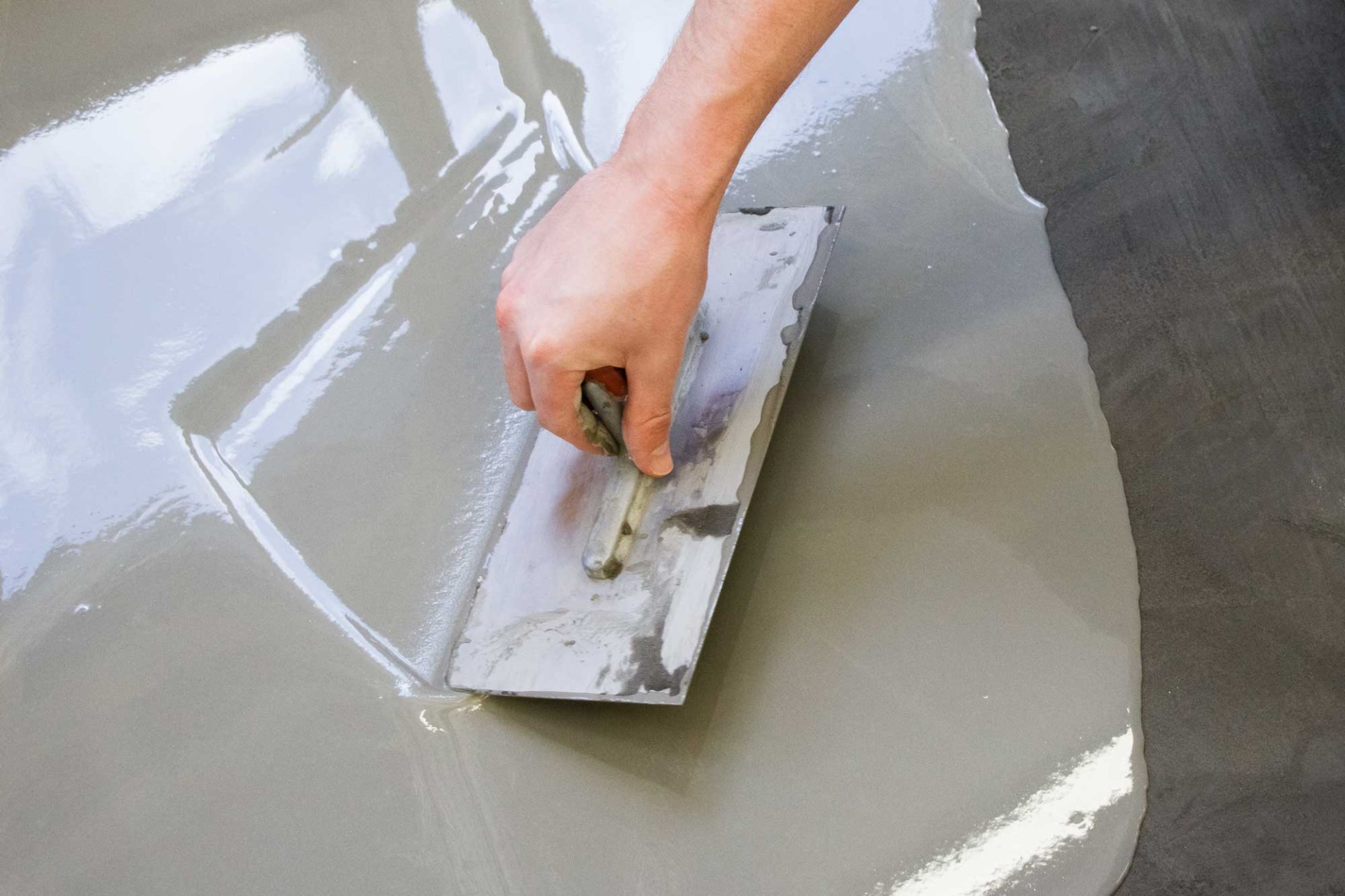 Dès que celle-ci a durci, le sol est enduit de colle, les lés découpés sont déroulés avec précision et pressés uniformément.